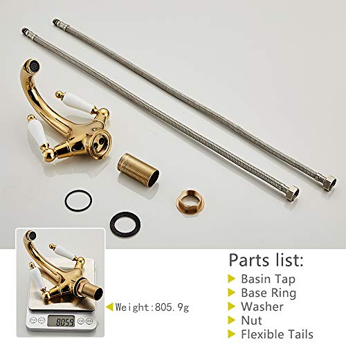 Maynosi - Miscelatore monoblocco per lavabo in ceramica con doppia leva, stile vittoriano e vintage, finitura oro in ottone massiccio
