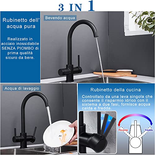 Maynosi Rubinetto Cucina 3 Vie per Sistemi Osmosi, 3 in 1 Rubinetti Cucina, Miscelatore Cucina per Acqua Fredda e Calda e Filtro, Girevole a 360 °, Includere tubi flessibili, ottone (Nero opaco)