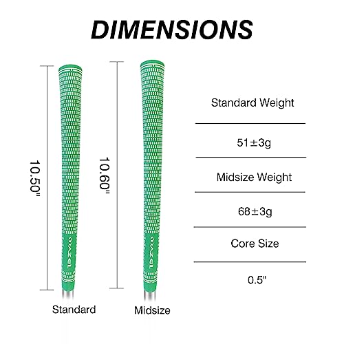 Specifiche del prodotto: la confezione include 10 impugnature da golf (senza nastro adesivo e solvente per impugnatura), dimensioni del nucleo: 1,5 cm, lunghezza impugnatura: 26,7 cm, peso impugnatura: 55 g.