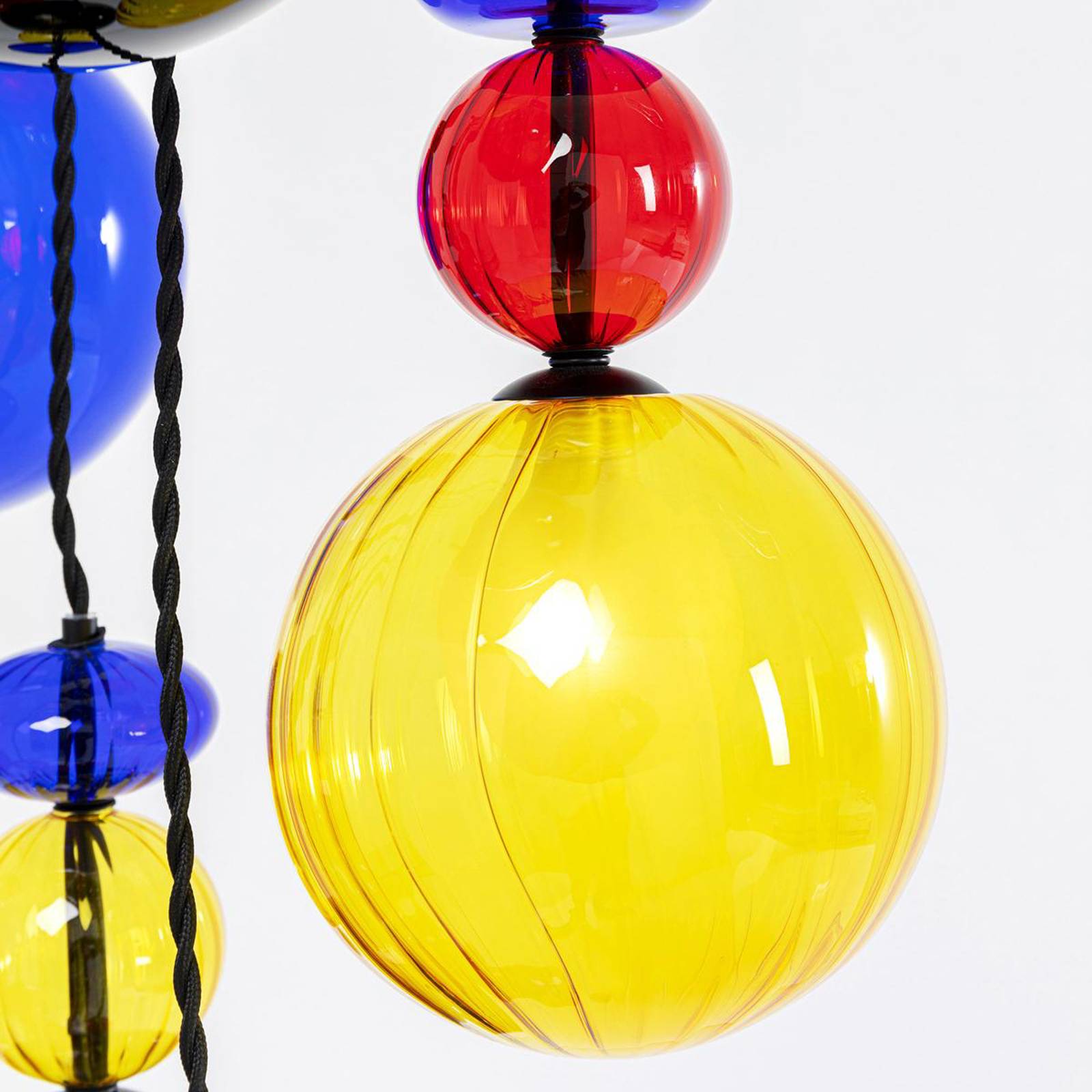 Lampada a sospensione a 9 luci in vetro Mazzo Nove dal design colorato La lampada a sospensione Mazzo Nove è dotata di un rosone rotondo in acciaio nero. Sotto di esso sono disposte nove lampade a sospensione, ognuna con un portalampada rivolto verso il basso. L'elemento centrale del design è costituito dai paralumi sferici e da altri elementi in vetro in varie tonalità di colore. Questo conferisce alla lampada a sospensione Mazzo Nove un carattere creativo, vivace e colorato.