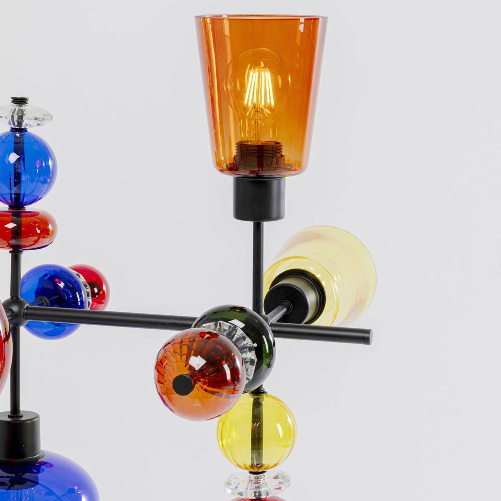 Lampada a sospensione in vetro Mazzo Otto a 8 luci dal design colorato La lampada a sospensione Mazzo Otto è dotata di una struttura in acciaio nero composta da un rosone rotondo, una sospensione ad asta verticale e bracci che si estendono verso l'esterno. Questi ultimi sostengono i portalampada, che sono diretti verso l'alto, verso il basso e verso l'esterno. L'elemento centrale del design è costituito dai paralumi e dagli altri elementi in vetro in numerose forme e colori diversi. Questo conferisce alla lampada a sospensione Mazzo Otto un carattere creativo, vivace e colorato.