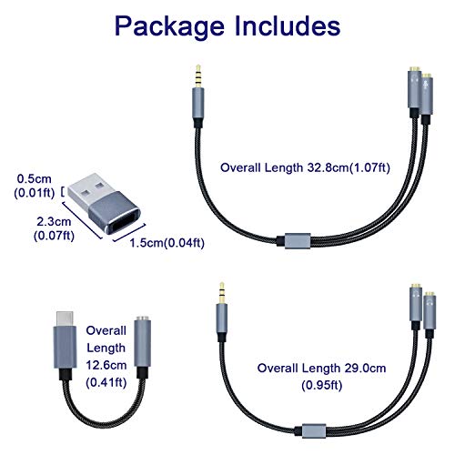 - Package include: 1 x USB2.0 to USB-C Adapter, 1 x 3.5mm Y Splitter Stereo Audio Cable(Dual Headphone), 1 x 3.5mm Y Splitter Microphone Headphone Audio Cable, 1 x USB Type C to 3.5mm Female Headphone Jack Adapter