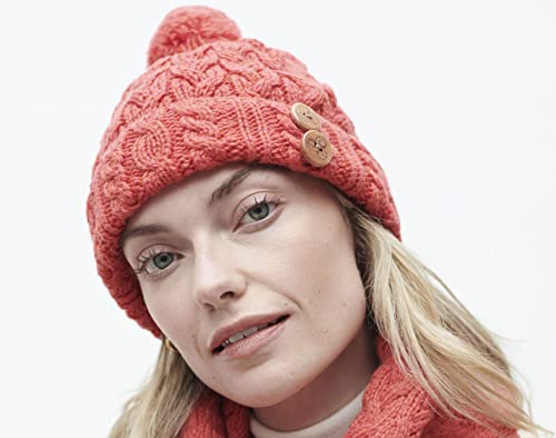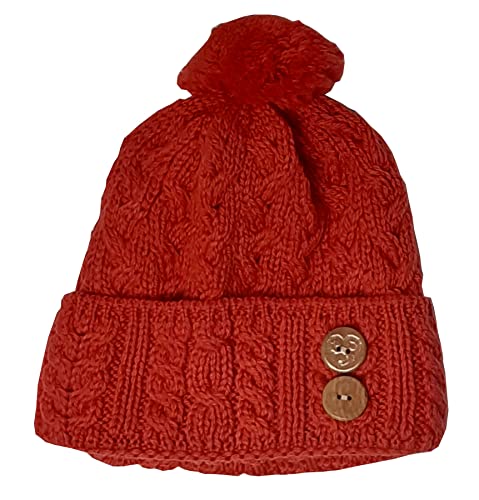 McLaughlin's Irish Shop Berretto da donna irlandese con pompon e bottoni, rosso corallo, Taglia unica