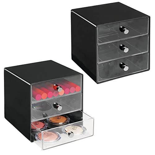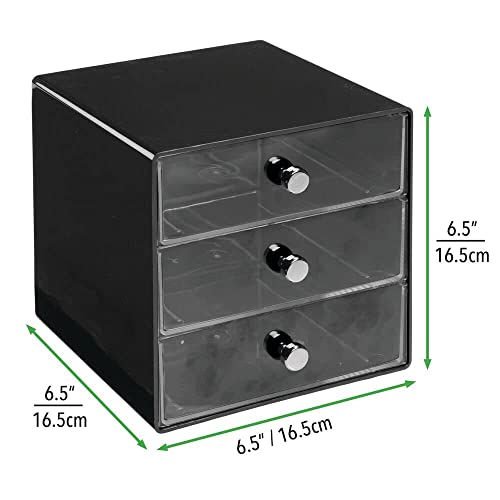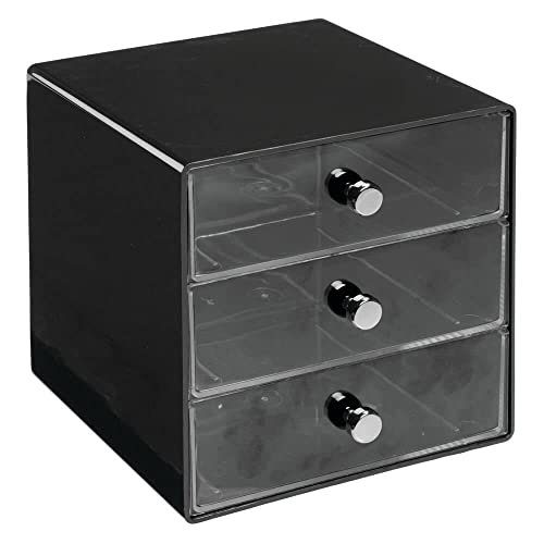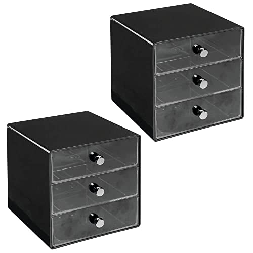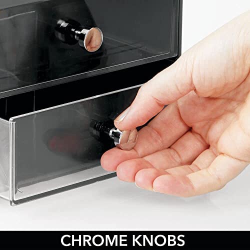 MDesign Set da 2 Cassettiera in plastica resistente - Mini cassettiera per cosmetici con tre scomparti - Elegante porta cancelleria con manici cromati - nero/trasparente