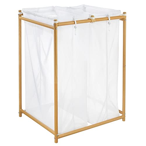 MDesign Cesto portabiancheria bagno o lavanderia - Doppio sacco per la biancheria in tessuto a rete traspirante - Mobiletto per bagno con struttura in legno di bambù - bianco/colore naturale