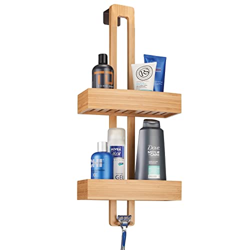 MDesign Mensola da doccia senza foratura, supporto portaoggetti per doccia da appendere, utensile da bagno in legno e metallo, cestelli per accessori da doccia, colore bambù