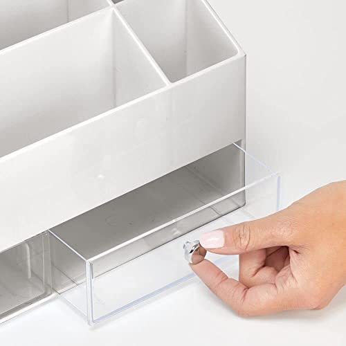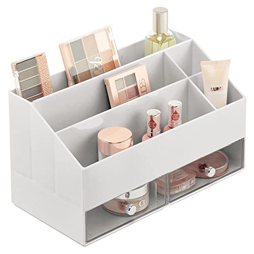 MDesign Organizer per Cosmetici in plastica - Portatrucchi con 5 Scomparti e 2 cassetti per Trucchi e Accessori - Porta Trucchi per Ripiani o cassetti - Grigio Chiaro/Trasparente