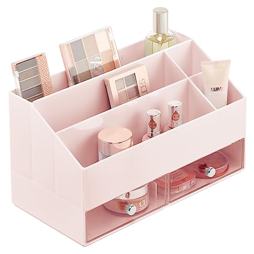 MDesign Organizer per cosmetici in plastica - Portatrucchi con 5 scomparti e 2 cassetti per trucchi e accessori - Porta trucchi per ripiani o cassetti - rosa e trasparente