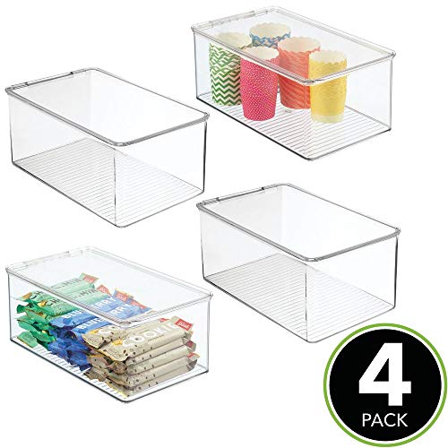 MDesign Set da 4 organizer cucina con coperchio - Vaschetta da frigo impilabile per cucina e dispensa - Contenitore alimenti per tè, caffè e snack in plastica senza BPA - trasparente