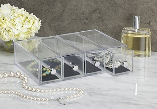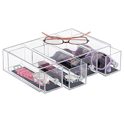 MDesign Organizer Gioielli - 4 cassetti in plastica per Gioielli, Elastici per Calli, Trucchi - Pratica Mini cassettiera da toeletta Perfetta Anche per Il Bagno - Trasparente