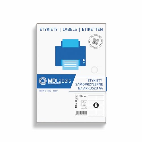 MDlabels Etichette universali, DIN A4 (105 x 70 mm, 100 fogli, 800 etichette adesive) di carta opaca, autoadesiva, stampabile, permanente