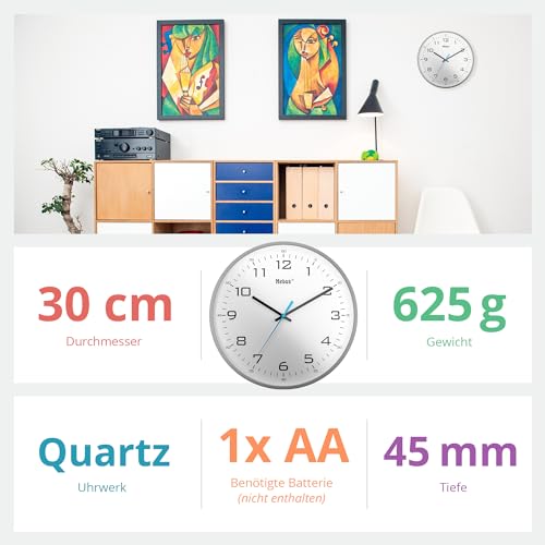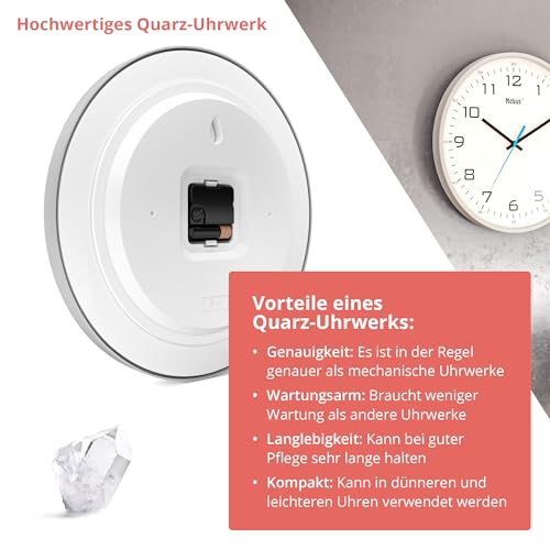 Grande orologio da parete: il grande orologio da parete rotondo ha un diametro di 30 cm - questo corrisponde a circa un grande piatto piano o un piccolo piatto per pizza. Movimento al quarzo di alta qualità: un piccolo cristallo garantisce un funzionamento fluido. Questo visualizza in modo affidabile l'ora corretta ed evita deviazioni. Puoi contare su it