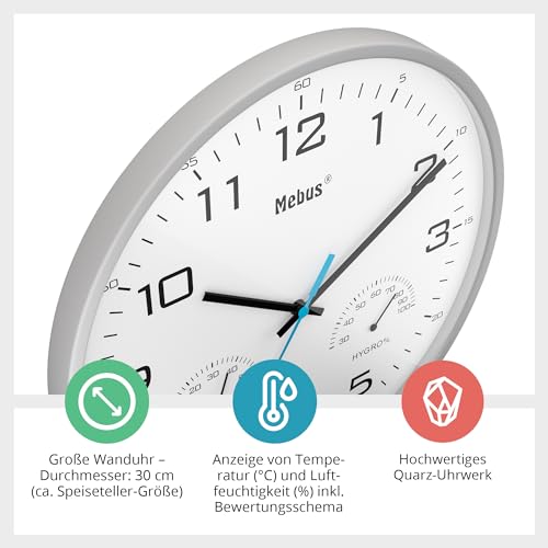 Mebus Orologio da Parete analogico al Quarzo con termometro e igrometro per Temperatura e umidità, Grigio, 30 cm Diameter