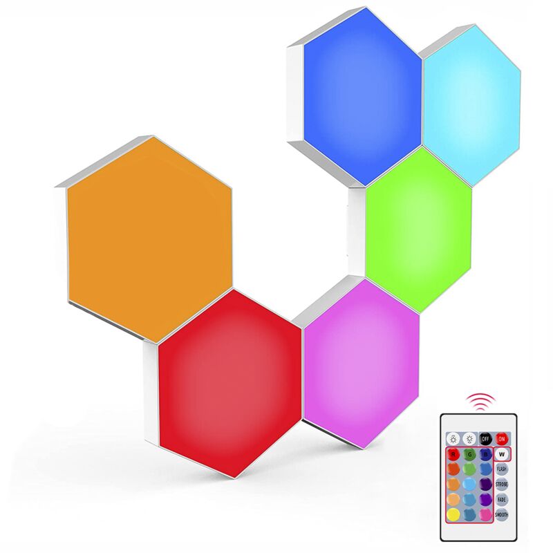 Applique esagonali, forniscono una buona illuminazione per ogni tipo di ambiente. Fissa gli applique al muro e dai spazio alla tua fantasia, crea motivi o forme e illumina gli spazi di casa. Perfetto per la decorazione di feste o sale da gioco. Puoi regolare l'emissione di luce accendendo e spegnendo ogni singolo applique. Questi applique esagonali sono RGB puoi scegliere una selezione di 13 luci colorate. Puoi scegliere l'intensità di luce, dispone di funzioni di lampeggio a colore singolo, commutazione lenta, commutazione veloce e funzione di temporizzazione. Il tutto può essere gestito tramite apposito telecomando in dotazione. Sono a basso consumo e risparmio energetico, le lampade funzionano con 3 pile mini stilo AAA (non incluse) per ogni pannello. All'interno della confezione sono inclusi cuscinetti adesivi per l'installazione su una varietà di superfici. Caratteristiche: 6px Lampade Forma esagonale Luce a LED RGB Materiale: Plastica PC Controllo Touch Telecomando Batteria