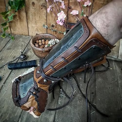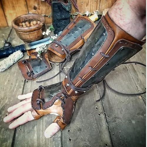 Medievale Steampunk Vintage Arm Guard Guanti da Boxe Hand Guard Faux Leather Wide Bracer Lace Up Arm Armor Cuff Rivet Archer Gauntlet Costume per Gli Uomini,Marrone,M