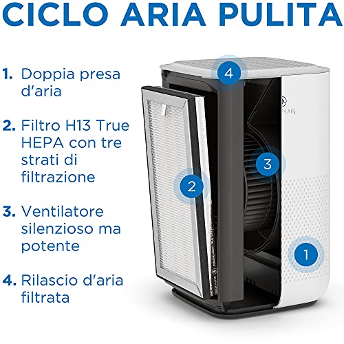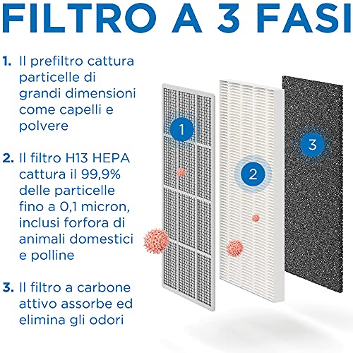 FILTRAZIONE HEPA H13: Rimuove il 99,9% delle particelle nocive inclusi allergeni, odori, COV, fumo, polline, peli di animali domestici, polvere, contaminanti e altro fino a 0,1 micron. Cattura le particelle più fini dell'HEPA H11 (0,3 micron).