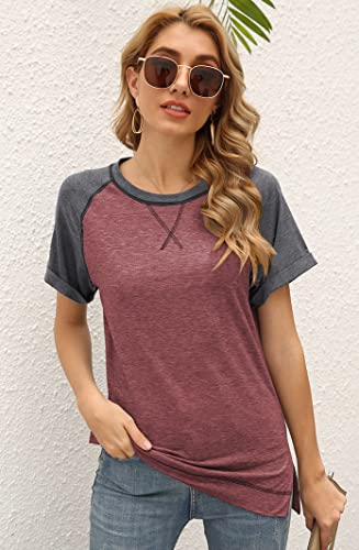 MEDUOLA Donna sciolte a Maniche Corte Estate T-Shirt Collo Rotondo collisione Manica Tee Orlo Aperto T-Shirt S,Pin Rosso