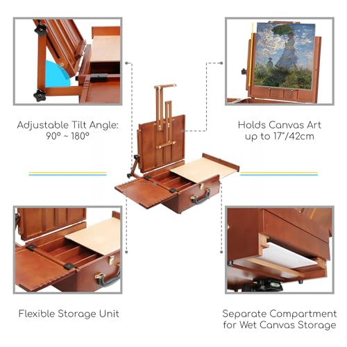 DIPINGI OVUNQUE TI PIACE - Questa scatola tutto in uno è stata progettata per viaggiare dal mare alla vetta e ovunque nel mezzo. Con un treppiede in piedi, può essere utilizzato come plein air come un cavalletto francese. Con i paracolpi in gomma sul fondo, può essere utilizzato anche come piccolo cavalletto da tavolo per l'uso in studio. La sua versatilità ti consente di dipingere ovunque tu voglia.