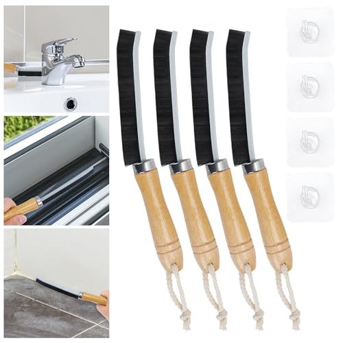 Meejoy 4 Pezzi Spazzola per la Pulizia delle Fessure, Spazzola Pulizia Fessure a Setole Dure, Multifunzionale Spazzola Pulizia Doccia con 4pcs Gancio per Bagno Cucina Fughe Pavimenti (Manico Legno)
