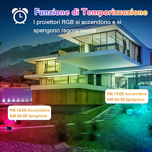 ⏲️【Funzione timer】Il RGB Faretti Outdoor può essere impostato individualmente nell'app Bluetooth per impostare l'ora di accensione e spegnimento della luce.Una volta impostati gli orari di accensione e spegnimento giornalieri, non è più necessario accendere e spegnere manualmente la luce ogni giorno, risparmiando tempo ed elettricità.Il proiettore RGB ha una funzione di memoria in modo che quando la luce è spenta, il colore è blu e quando viene riaccesa, anche il colore è blu.