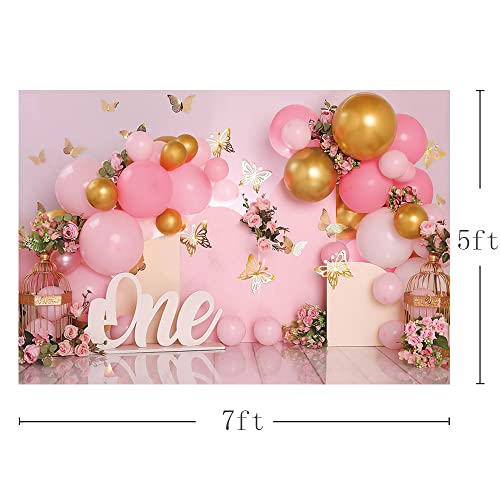 MEHOFOND 7x5ft Pastello Rosa Ragazza 1 ° Compleanno Banner Palloncini Gabbia Uccello Farfalla Fiore Arcuato Sfondo Piatto Decorazione Del Partito Ritratto Del Bambino Fotografia Puntelli Forniture