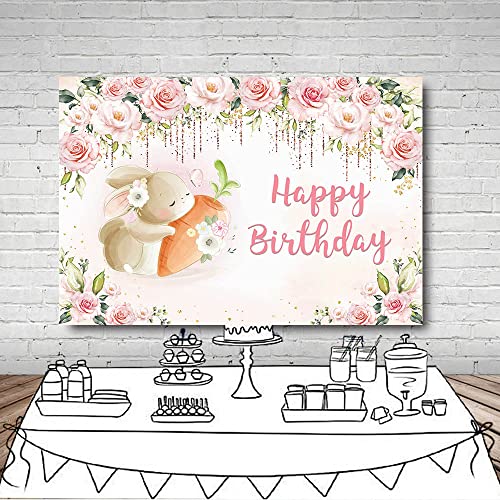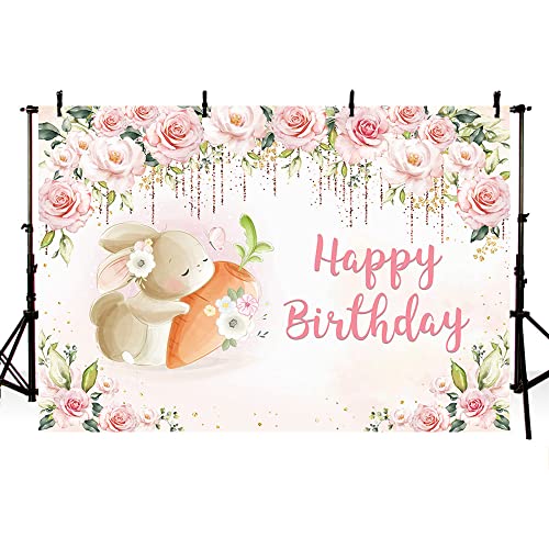 MEHOFOND 7x5ft Rosa Ragazza Coniglietto Bambino Compleanno Sfondo Primavera Fiore Pastello Fotografia Sfondo Rosa Floreale e Verde Foglia Festa Banner Torta Smash Decorazione Regalo Forniture
