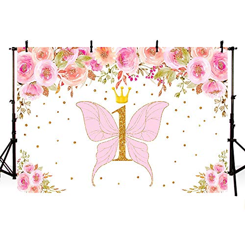 MEHOFOTO 2,1 x 1,5 m Farfalla Ragazza Primo Compleanno Foto Studio Booth Sfondi Rosa Floreale Principessa 1° Compleanno Rosa e Oro Fotografia Sfondo Banner