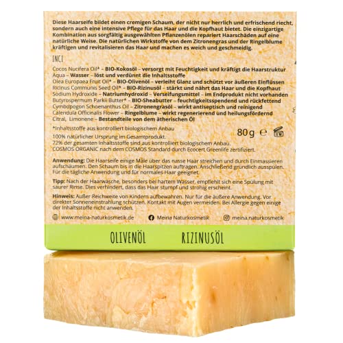Meina | Sapone per capelli cosmetico naturale | Shampoo bio con citronella e fiori di Ringel (1 x 85 gr.) | Prodotto per capelli resistente per uomini e donne | Vegano