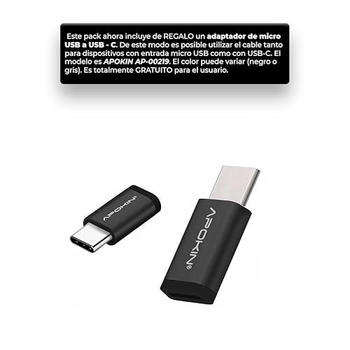 NUOVO! Questa confezione include ora un adattatore da micro USB a USB - C, in questo modo è possibile utilizzare il cavo sia per dispositivi con ingresso micro USB che con USB-C. Il modello è APOKIN AP-00219. Il colore può variare (nero o grigio). È totalmente GRATUITO per l'utente.
