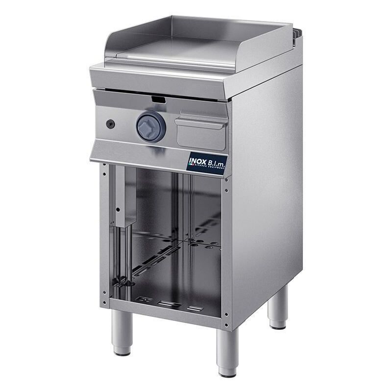 Fry Top a gas piastra liscia inox Bim. Le piastre, sono realizzate in acciaio spessore 15 mm e, durante il funzionamento, controllate da rubinetto termostato da 8 posizioni, temperatura massima 250/280°C. La zona di cottura ha una buona uniformità di temperatura e si espande per tutta la dimensione della piastra. La piastra nella parte anteriore è dotata di un canale raccogli grassi. Tutte le versioni, a richiesta, possono essere realizzate con piastra rivestita al cromo duro. Nelle versioni con piastra cromata viene montato un termostato di sicurezza. Smontando il cruscotto esterno è tutto a portata di mano e tutti i componenti si possono sostituire dal lato anteriore della macchina. Il cassetto raccogli liquidi estraibile permette di fare velocemente le operazioni di pulizia.Fry Top a gas piastra liscia inox Bim. Ottima qualità. Per Alberghi e grandi impianti di Ristorazioni. Ottime prestazioni. Visita sito.400x900x850/900H - Kg.90 - Kw.9