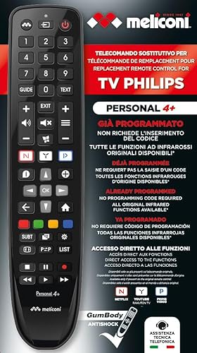 Meliconi Gumbody Personal 4+, Telecomando per TV PHILIPS, sostituisce il telecomando originale. Già preprogrammato. Corpo in gomma antishock. Supporto web e assistenza telefonica specializzata