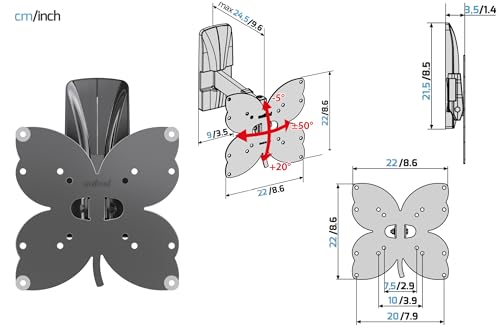 Distanza minima dal muro: min 3,5 cm max 24,5 cm, portata 25 kg, inclinazione orizzontale 50°, verticale -5° 20°