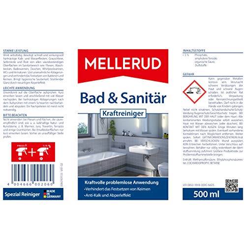 Contenuto della confezione: 1 detergente Mellerud per bagno e sanitari da 0,5 l / impedisce la formazione di germi e fa brillare le superfici, effetto anticalcare e antiperla