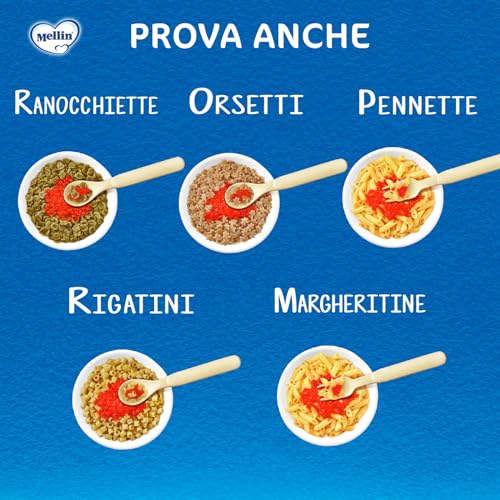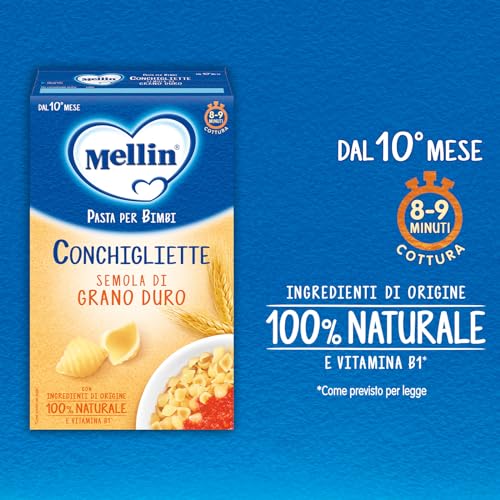 Mellin Conchigliette è un formato di pasta di semola di grano duro italiano per bambini, con ingredienti di origine 100% naturale e Vitamina B1
