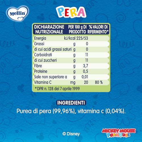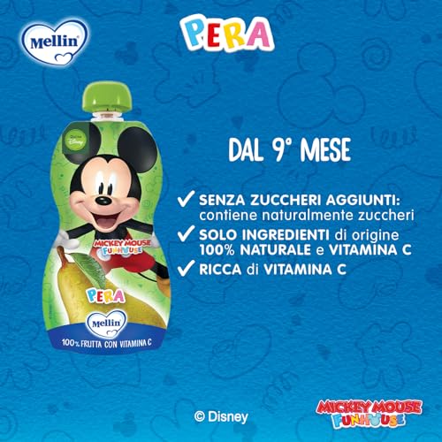 MELLIN Merenda alla frutta, Pouch Disney Mickey Mouse, 100% Frutta, gusto Pera 110g