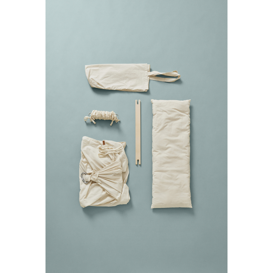 Dettagli del prodotto: Culla in piuma naturale con materasso, lenzuolo e piuma Ricorda l'abbraccio e i dolci movimenti a dondolo dei genitori Si adatta al corpo del bambino Dà al bambino una sensazione di sicurezza e protezione Perfetta per i bambini irrequieti o che fanno brevi sonnellini Permette un sonno tranquillo Può essere utilizzato con il motore della culla a molla Realizzato in cotone (biologico) Materiale e cura: Materiale della culla: 100% cotone (biologico) Materiale del rivestimento del materasso: 100% cotone (biologico) Materiale di riempimento del materasso: poliestere Traversa in legno di betulla Piuma nella fodera di cotone L'amaca può essere lavata a mano a 30° C. Non lavare l'amaca troppo spesso Rimuovere il materasso, il moschettone e la traversa in legno prima del lavaggio Il materasso può essere lavato solo con un lavaggio delicato a mano a max. 30° C. Utilizzare solo detersivi adatti alla lana Strizzare l'acqua in eccesso arrotolando il materasso in un asciugamano Stendere il materasso in orizzontale per farlo asciugare Girare il materasso durante l'asciugatura Raccomandazione: arieggiare due volte al mese in condizioni di tempo asciutto. Dimensioni e peso: Caricabile fino a un massimo di 15 kg Superficie di sdraio: 90 cm Peso: 2 kg La consegna include: 1 culla a molle in cotone 100 % (biologico) 1 traversa in legno di faggio 1 culla normale con cintura di sicurezza e sacchetto di cotone 1 sacchetto di tessuto in 100% cotone (biologico) 1 materasso con imbottitura in poliestere e rivestimento in cotone (biologico) 1 lenzuolo per bambini in 100% cotone (biologico) 1 moschettone grande con tappo a vite e isolamento in gomma