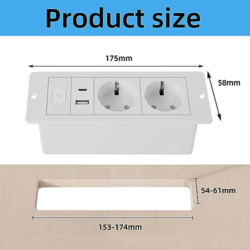 Facile installazione: basta aprire un foro rettangolare sul tavolo e installare la presa su di esso. Dimensione foro: 160 mm x 58 mm (lunghezza x larghezza)