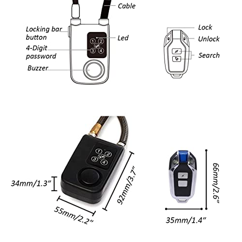 【2 modi per bloccare e sbloccare】 Questo cavo di blocco può essere bloccato/sbloccato tramite telecomando o password, senza bisogno di chiavi. Distanza telecomando fino a 40 metri. Password a 4 cifre, combinazione di password fino a 256 gruppi.