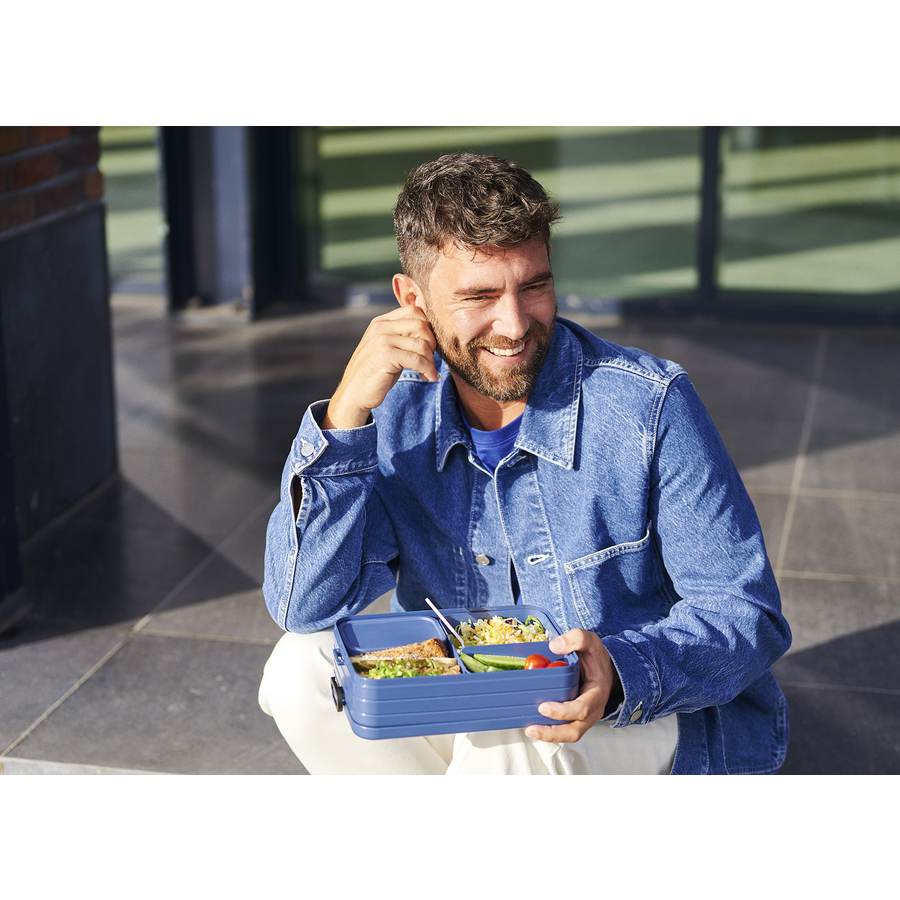 Dettagli del prodotto: Il portapranzo ideale per i grandi appetiti Include 2 diversi inserti bento e una forchetta da snack Scatola per il pranzo per un massimo di 4 panini Con chiusura a scatto Disponibile nei bellissimi colori di Nordic Design: nordic blu Materiale e dimensioni: Polipropilene (PP), acrilonitrile butadiene stirene (ABS), elastomeri termoplastici (TPE). Capacità: circa 900 ml Istruzioni per la conservazione e la cura: Lavabile in lavastoviglie Non adatto al congelatore o al microonde La consegna include: 1 x scatola per il pranzo 2 x bento box 1 x divisorio 1 x forchetta per spuntini 1 x coperchio per la scatola piccola