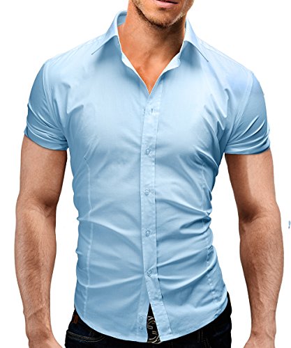 MERISH Camicia Uomo Slim Fit,Camicia Manica Corta Adatto per Tutte Le Occasioni,Casual e Chic 13 Diversi Colori Taglia S - XXL Modell 77 Blu Chiaro S