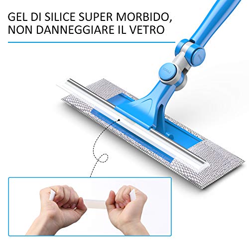 【Rotazione di 180° della testa tergivetro】: anteriore e posteriore regolabili a 180 °, sinistra e destra regolabili a 180 °, Ruota facilmente il tergivetro premendo un tasto, in modo da pulire angoli e bordi esterni della finestra. La testa tergivetro può essere usata da sola, o insieme al manico telescopico, per pulire posti più alti.