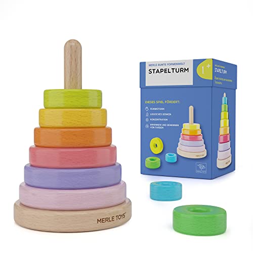 Merle Toys - Torre impilabile in Legno: Giocattolo motorio a Partire da 1 Anno, Giocattoli Montessori a Partire dai 12 Mesi, Regalo per Bambini, Primo Giocattolo educativo con 8 Anelli impilabili