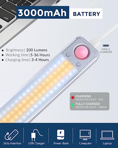 【Tempo di alimentazione a batteria a lunga durata】 Batteria ricaricabile integrata da 3000 mAh, questa luce per armadio a risparmio energetico e portatile consente di durare 0,5 mesi dopo una carica completa e sotto il sensore di movimento notturno. Inoltre, è conveniente essere ricaricato tramite qualsiasi dispositivo con porta USB-C, come computer, lampada da scrivania, power bank, caricabatteria per auto e così via.