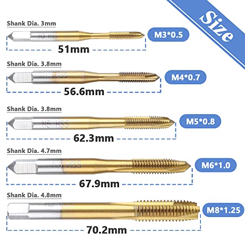 Mesee Set di 5 Maschi per Filettatura, Maschi per Filettare a Macchina Metrica in Acciaio HSS con Rivestimento in Titanio, Strumenti per Maschiatura Assortiti M3 M4 M5 M6 M8 per Filetti Riparati