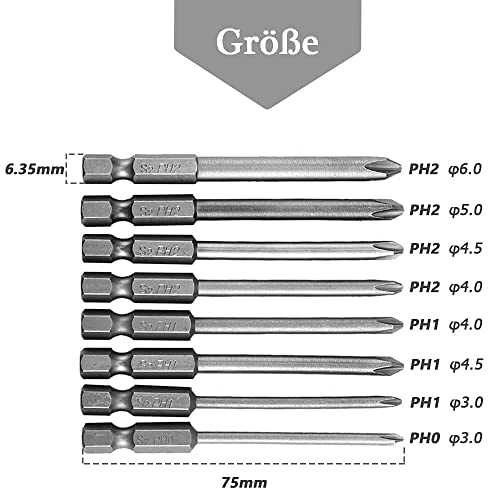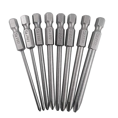 Mesee Set di 8 punte per avvitatore, S2, in lega di acciaio, magnetiche, lunghe e a croce, Philips, 75 mm