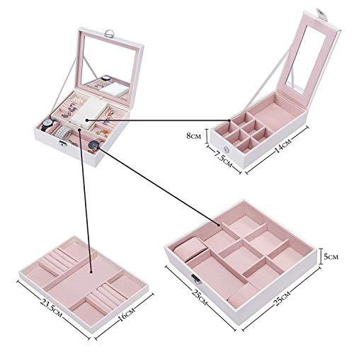 Meshela, portagioie, organizer per gioielli, su 2 livelli e con grande specchio, contiene collane, orecchini, anelli, bracciali, orologi, per donne e ragazze, in similpelle White