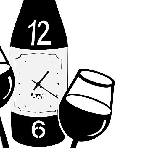 Orologio a forma di bottiglia con due calici ai lati del quadrante e le lancette in alluminio.