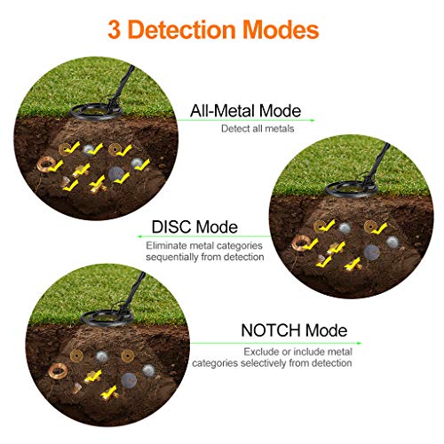 ★3 MODI DI RILEVAZIONE: questo metal finder utilizza la modalità ALL-METAL per rilevare tutti i tipi di metalli e la modalità DISC o NOTCH per eliminare i metalli indesiderati dal rilevamento;