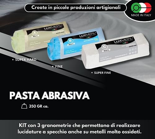 **Paste Abrasive di Eccellenza:** Il kit include paste abrasive di altissima qualità, formulate per rimuovere imperfezioni, ossidazione e macchie superficiali. Queste paste offrono un'azione efficace senza danneggiare la superficie del metallo.