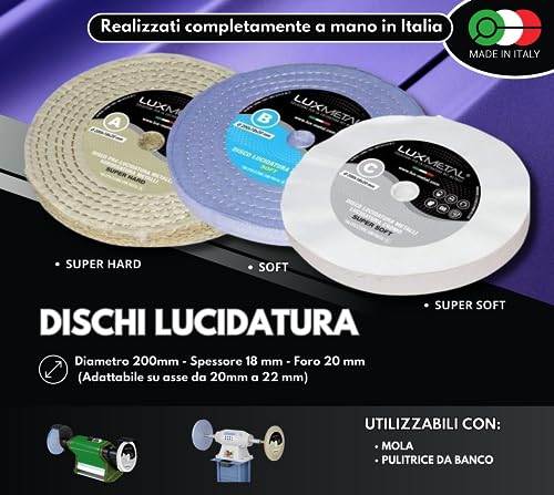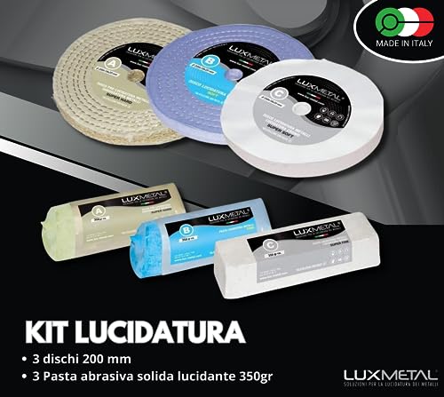 Lux Metal - Kit 3 Dischi Lucidatura da 200 mm e 3 Paste Abrasive da 350 gr - Perfetti per lucidare Metalli come Alluminio, Ferro, Acciaio Inox, Ottone, Bronzo, Rame, Argento, Oro, Legno e Plastica